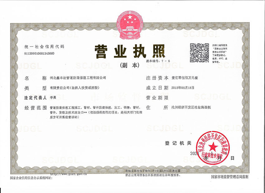 河北鑫豐達(dá)管道防腐保溫工程有限公司坐落于滄州市開(kāi)發(fā)區(qū),通過(guò)ISO9000質(zhì)量管理體系認(rèn)證。本廠擁有工程師4名、技術(shù)人員30名,員工60人,注冊(cè)資金5500萬(wàn)元。專(zhuān)門(mén)從事3pe/2pe防腐鋼管、保溫防腐鋼管、防腐螺旋鋼管、水泥砂漿防腐鋼管、等配套工程施工,以及防腐材料研發(fā)制造的大型專(zhuān)業(yè)化企業(yè)。是河北省防腐保溫行業(yè)協(xié)會(huì)理事單位。年生產(chǎn)能力500萬(wàn)平方米。